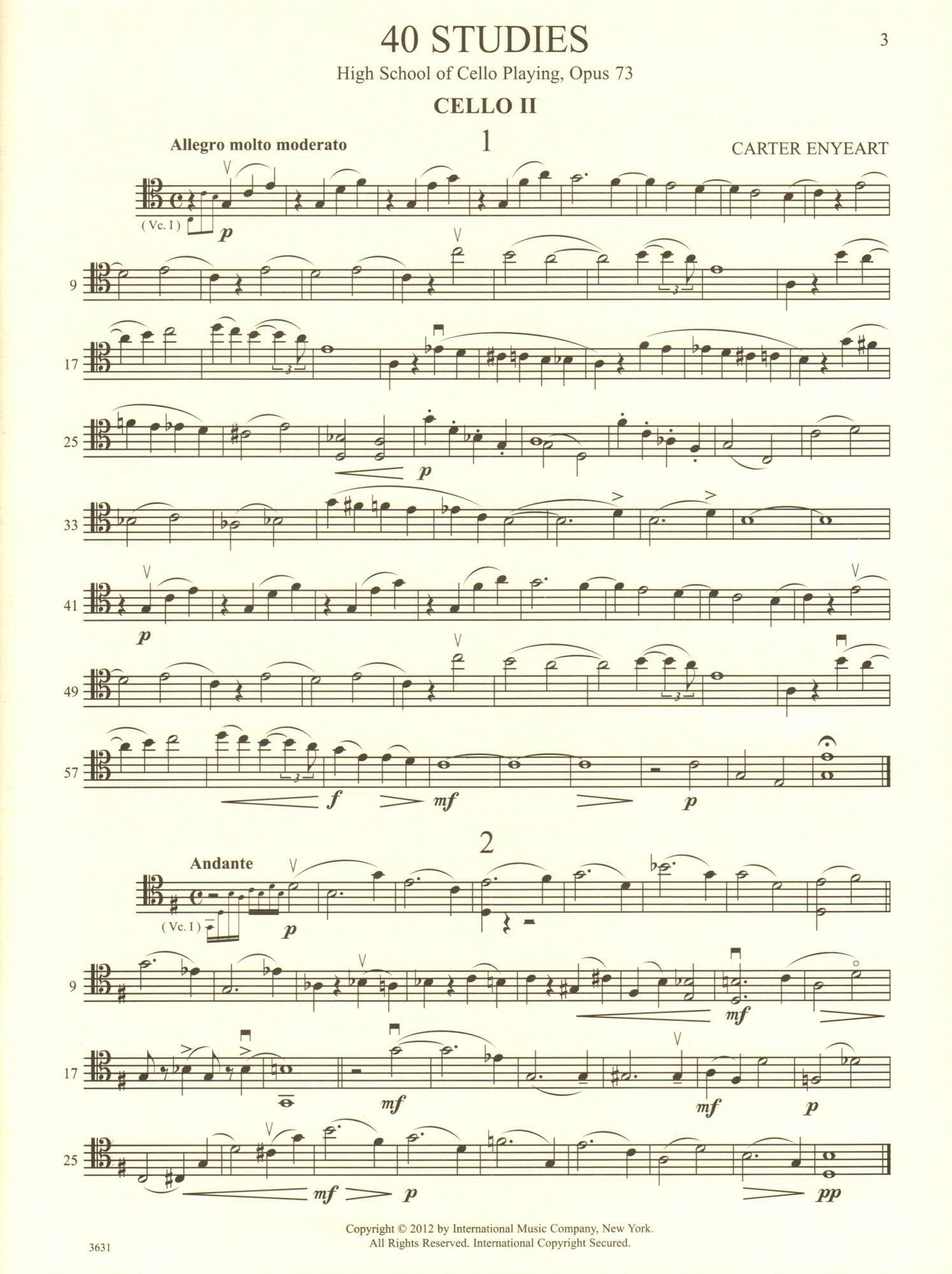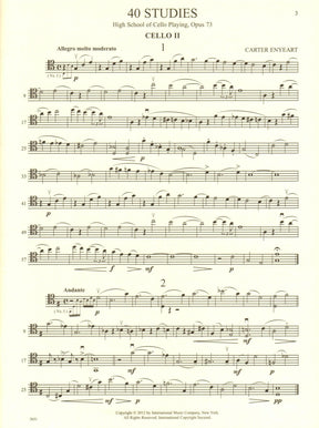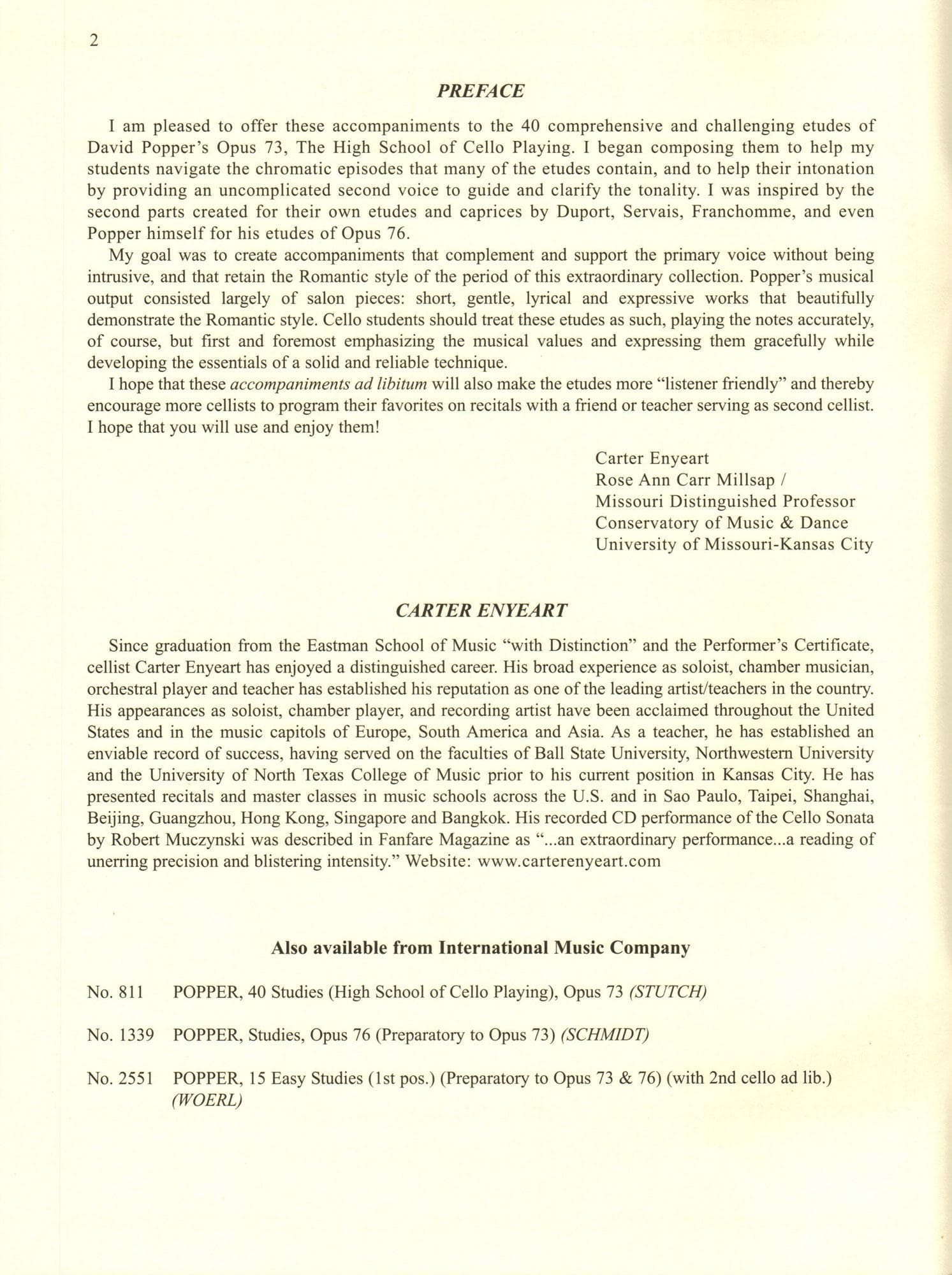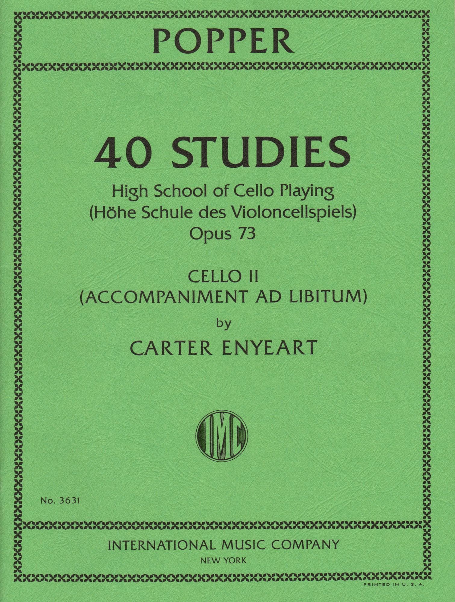 "I am pleased to offer these accompaniments to the 40 comprehensive and challenging etudes of David Popper's Opus 73, The High School of Cello Playing. I began composing them to help my students navigate the chromatic episodes that many of the etudes contain, and to help their intonation by providing an uncomplicated second voice to guide and clarify the tonality. I was inspired by the second parts created for their own etudes and caprices by Duport, Servais, Franchomme, and even Popper himself for his etudes of Opus 76...." - Carter Enyeart (from the prelude)