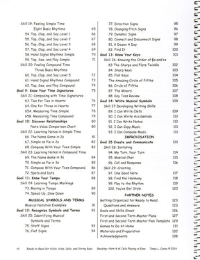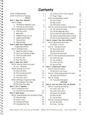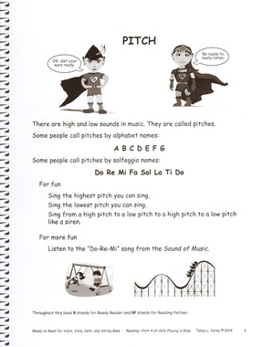 Ready to Read is written for Violin, Viola, Cello, and Bass players in a series of 100 games that prepare the reading process presented in Sight Reading Is Easy. There are 15 goals in the areas of Pitch, Rhythm, Musical Signs, Terms and Symbols, Notation, and Improvisation. Topics in pitch include: Singing, Alphabet, Fingerboard Geography, Staff Pitches, Whole and Half Steps, Major Scales, Pitch Memory, Dictation, Intervals and Chords, and Timbre/Tuning. Topics in rhythm include: Feeling the Pulse and Playing the Rhythm, 8 Basic Rhythms in Simple Time, 3 Basic Rhythms in Compound Time, Time Signatures, Notes and Relationships, Composing with Rhythms, and Tempos. Topics in Terms include Staff, Clef, Direction, Accidentals, Dynamics, Connectors and Disconnectors, and Key Signatures. Notation has worksheets to write Musical Notation. Improvisation has elementary excercises in melody, rhythm, and harmony. Game materials are included with the book!