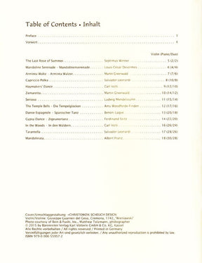 The piano part may be played by the teacher or an advanced student. As an alternative, the accompaniment can be played by a second violin. All the pieces are available in exemplary recordings on YouTube. From the contents of Volumes 1 and 2: Nursery rhymes, folksongs but also less well-known gems, as well as original pieces by the editors, all precisely tailored to meet the needs of young students.