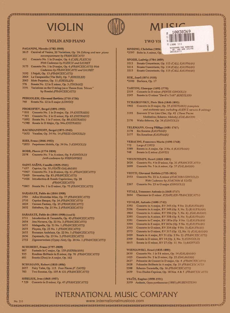 Schumann, Robert - 2 Violin Sonatas, Op 105 and 121 - Violin and Piano - edited by Francescatti - International Music Company