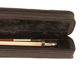 A strong and rigid, lightweight case with handle, featuring a padded plush interior, resilient black nylon exterior, and full length zipper. Fits one violin, viola, or cello bow. Adjustable velcro cushion keeps bows of varying length secure.