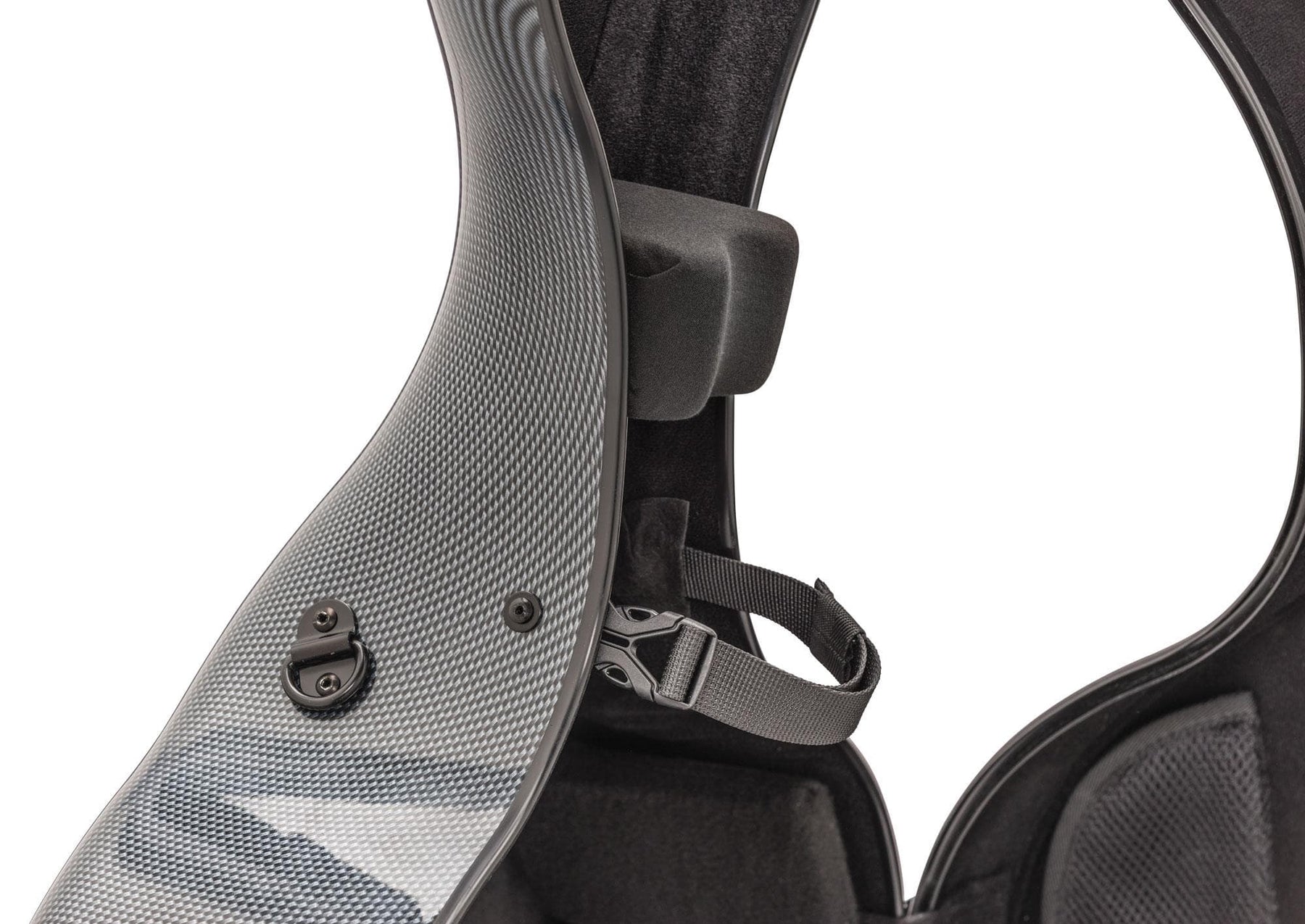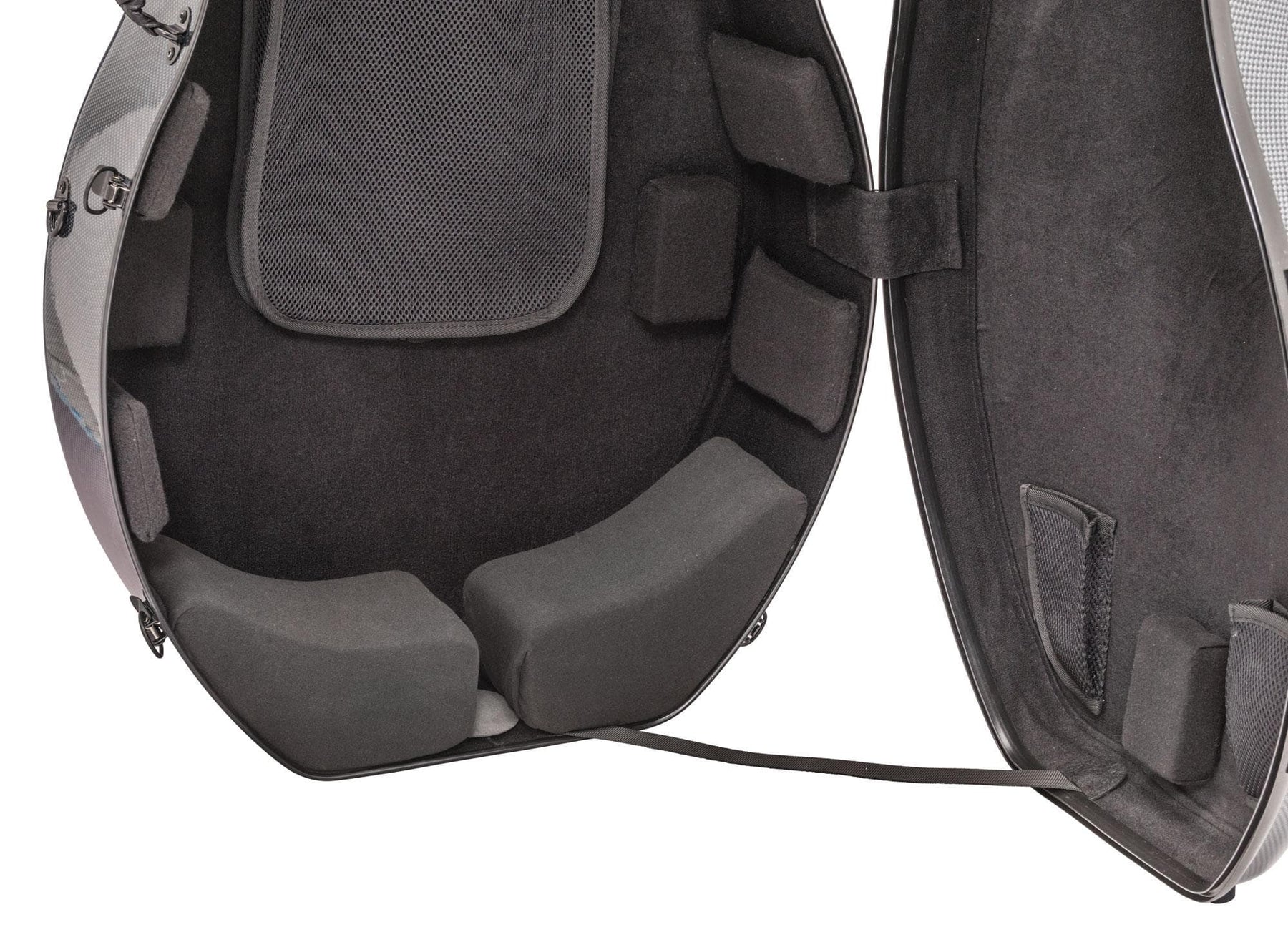 The SL Super Light Carbon Composite is now available for Montagnana pattern cellos! Strong and protective carbon hybrid shell cradles your cello. Black cloth interior, with built-in music folio and accessory pocket for a set of strings or rosin. D-rings are located so they will work with most aftermarket backpack carrying cushions, such as the Shar Backpack System.