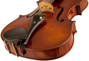 Teka style chinrest with a high, medium plate. Made from black plastic for Violin and Viola. Perfect for players with long necks.