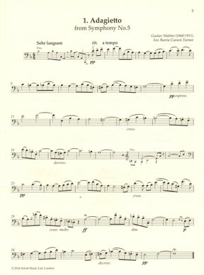 These 50 classical works for cello are crowd favorites and highly recognizable. Arranged by Barrie Carson Turner, they have retained all of their flair and character but are slightly shortened with a ceiling on the difficulty level to be approachable by advancing intermediate students. See the images for the table of contents.
