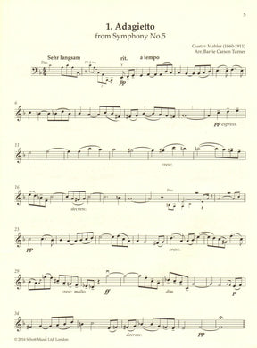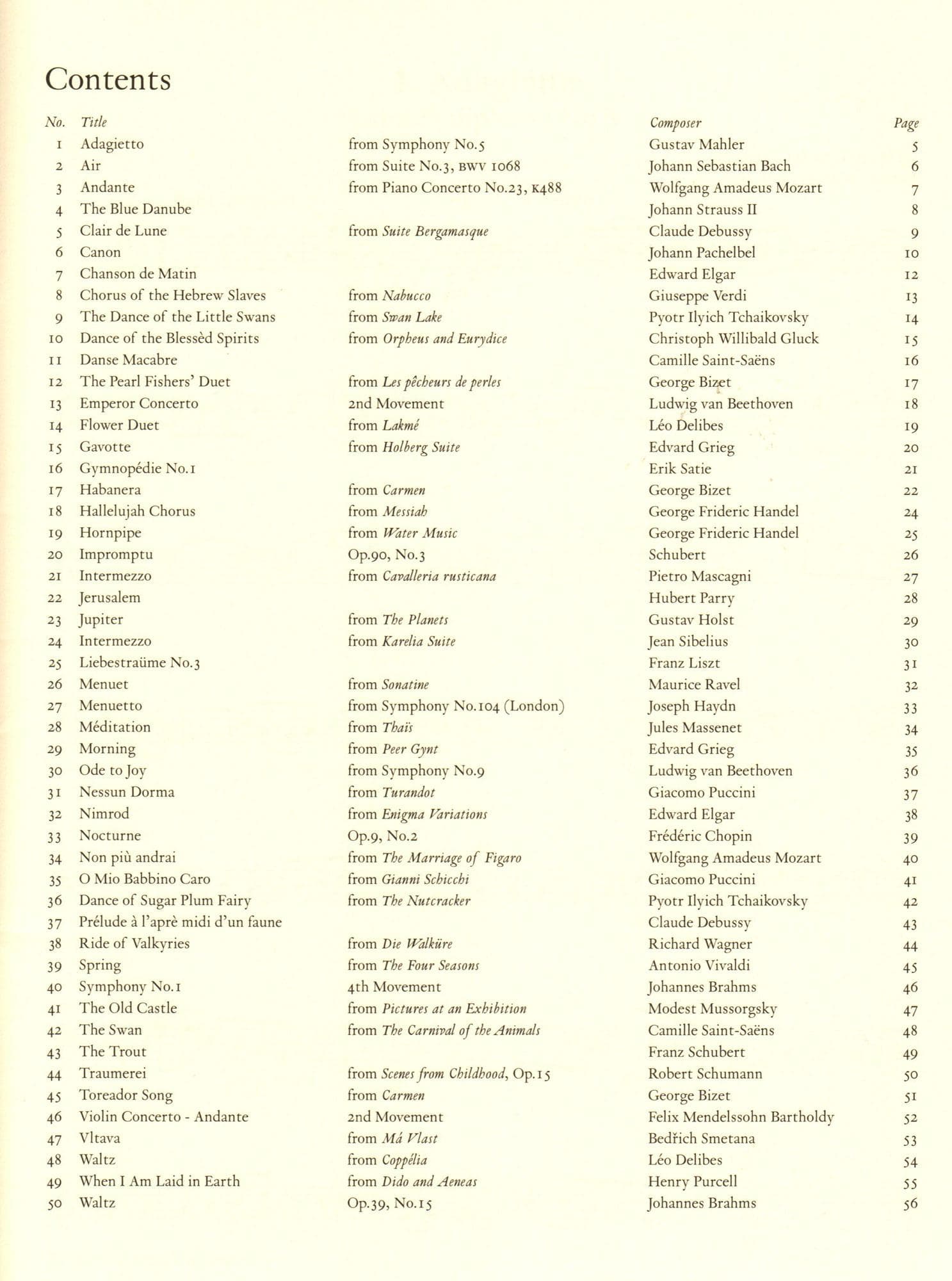 These 50 classical works for violin are crowd favorites and highly recognizable. Arranged by Barrie Carson Turner, they have retained all of their flair and character but are slightly shortened with a ceiling on the difficulty level to be approachable by advancing intermediate students. See the images for the table of contents.