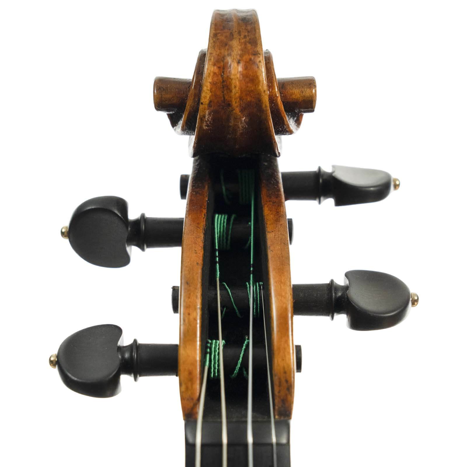 The back is of one piece of maple cut on the quarter of medium width flame ascending from left to right. The ribs and scroll are of similar maple. The top is of two pieces of spruce cut on the quarter of medium width grain widening slightly at the flanks. The varnish is red-brown over a golden ground.