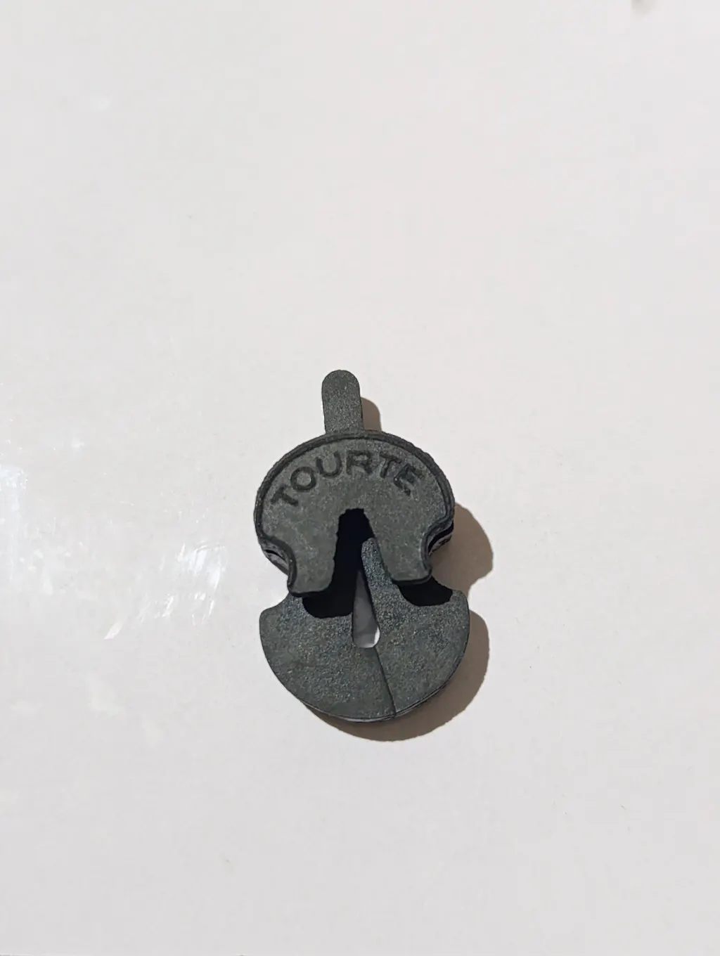 The original Tourte mute is the world's most popular orchestra mute! There are many imitations available, but they are made from inferior die-cut synthetic rubber which sacrifices functionality, longevity, and sound quality. The original Tourte orchestra mute’s elastic molded rubber construction allows for ease and speed of application and removal, as well as superior sound by avoiding rattling and contact with the string where imitation mutes don’t. A small pin on the top makes it easy to remove and slide down the string when not in use. Used for chamber music, orchestra and personal practice - light muting level. Original: Not a Copy! Fits 4/4 - 1/8 size.