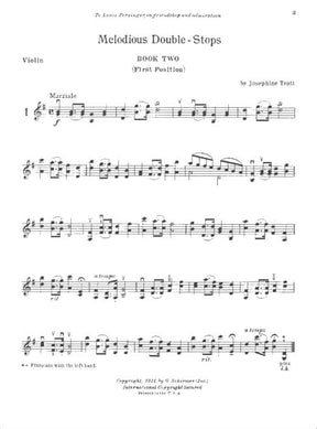 Melodious Double Stops, Book 2 continues in the style of Book 1, with helpful, short to medium-length double-stop exercises. It remains mostly in first position, with a few occasional stretches of the fourth finger. As in the other volume, the exercises are not just helpful for building technique, but are "melodious", and pleasant both to play and to hear. For Violin. By Josephine Trott. Published by G. Schirmer, distributed by Hal Leonard.