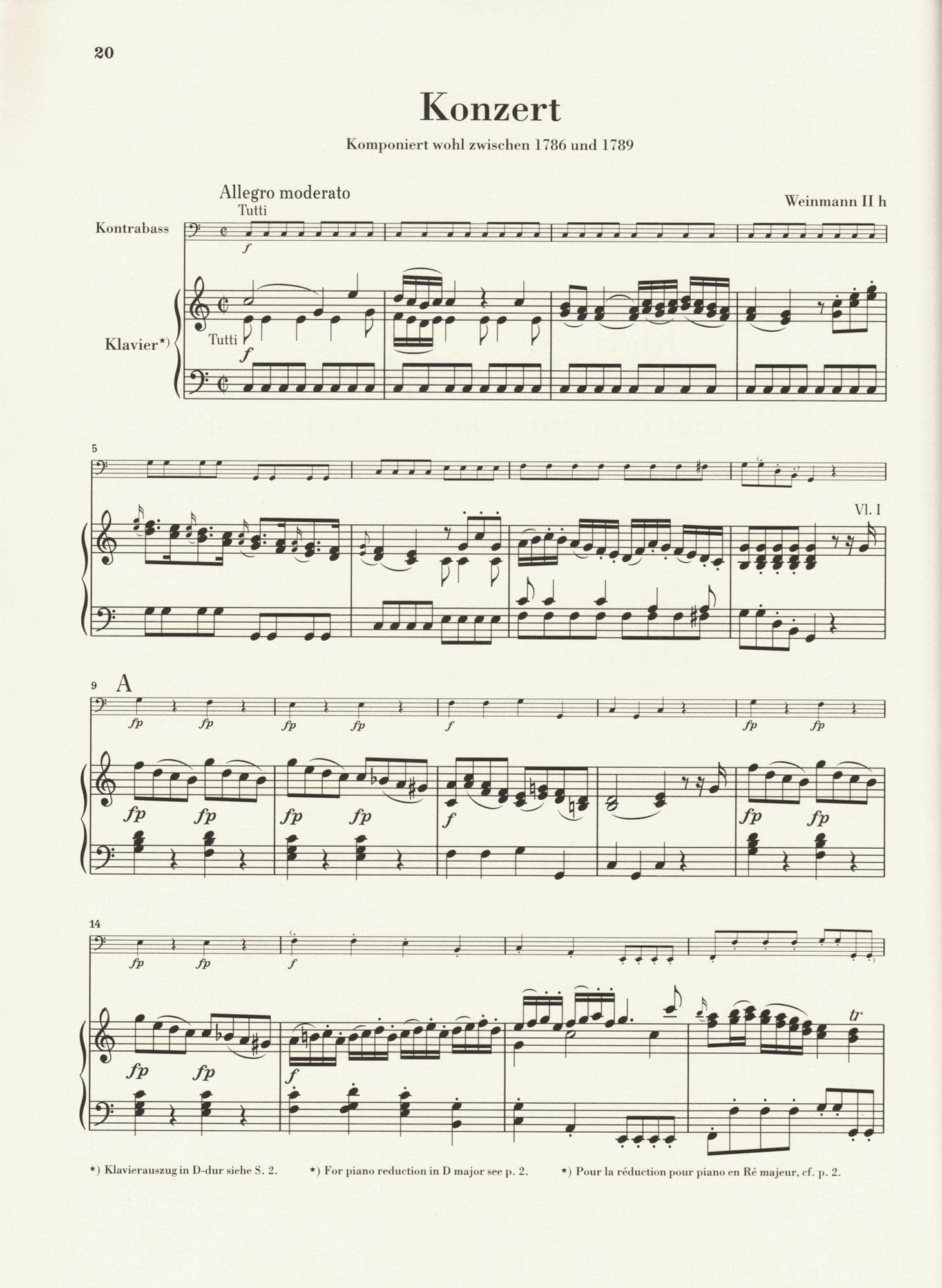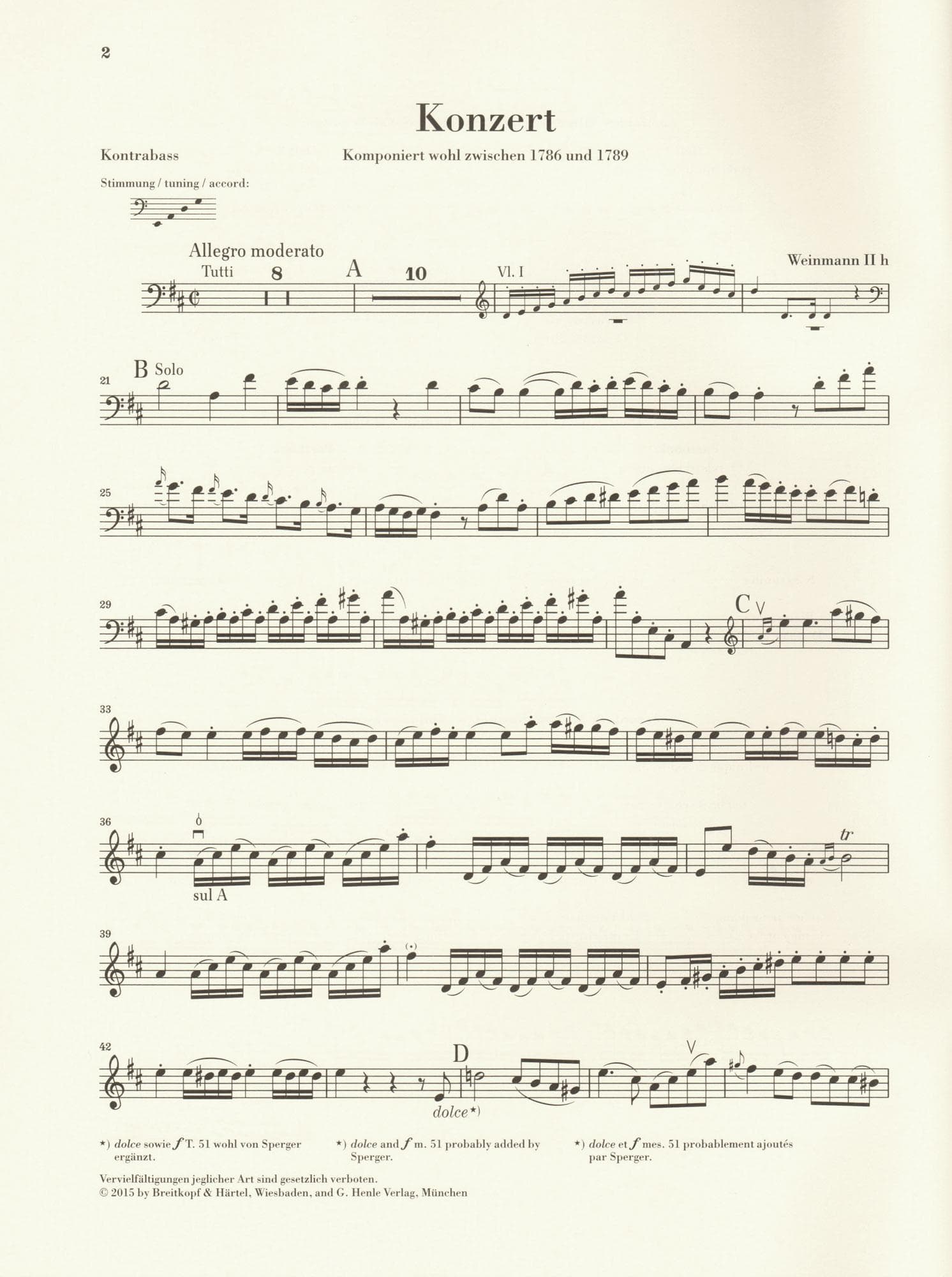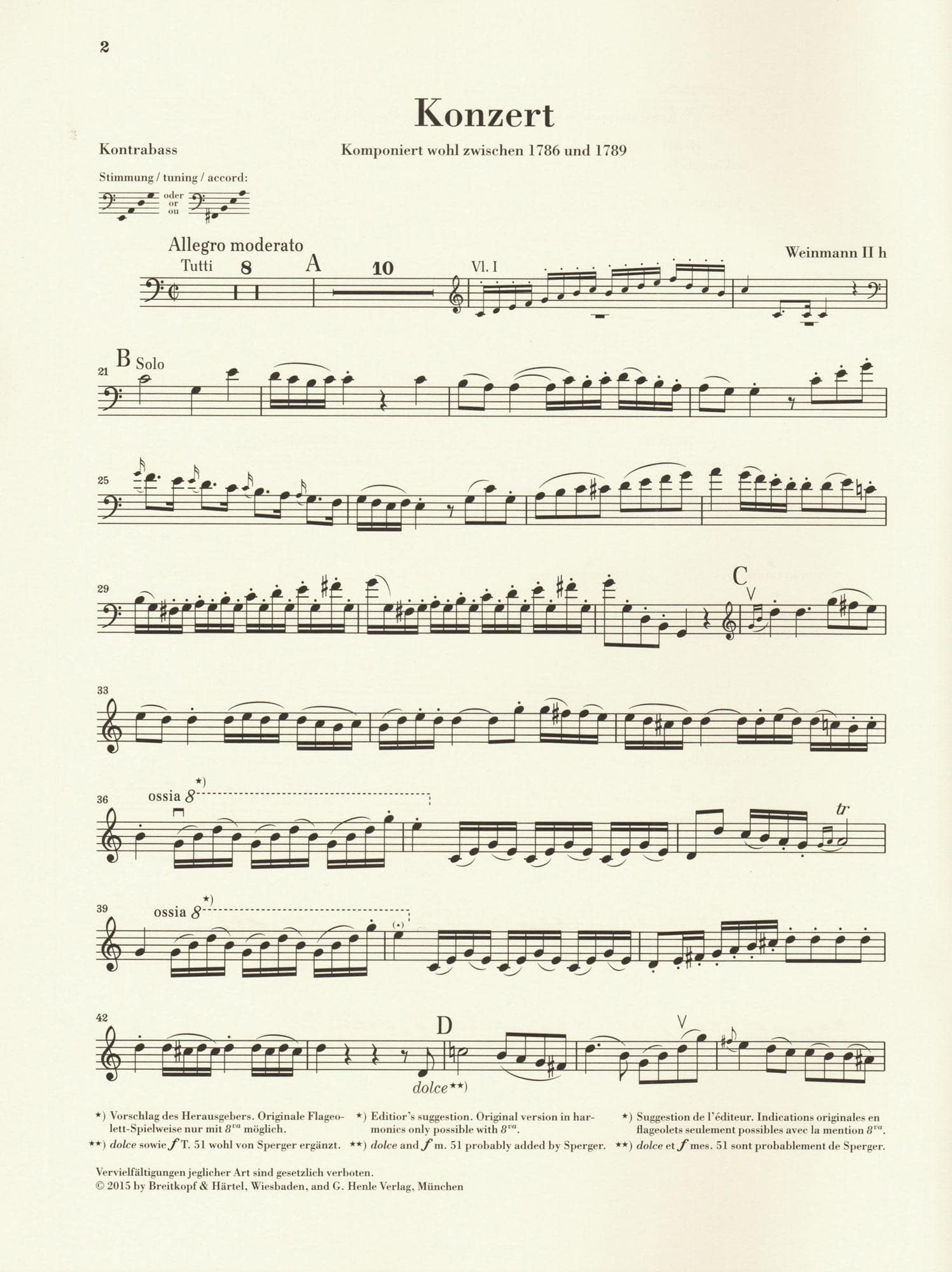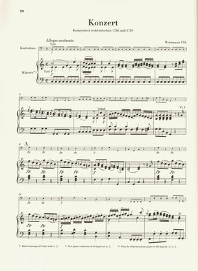 This Urtext edition includes three different engravings of the bass part which allows for four different tuning/key combinations: Standard "orchestra" tuning in C major or D major, Solo Tuning in D major, or "Viennese" tuning in D major. The piano reduction is then included twice - in D major, and in C major. The "Viennese Tuning" bass part includes Roman Numerals under the staff to always clarify which string is to be played on for any given note. Foreword and scholarly notations included.