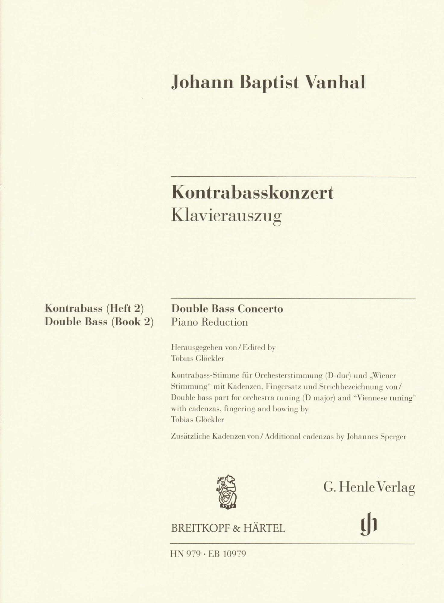 Vanhal, Johann Baptist - Double Bass Concerto - for Bass and Piano - G. Henle Verlag URTEXT