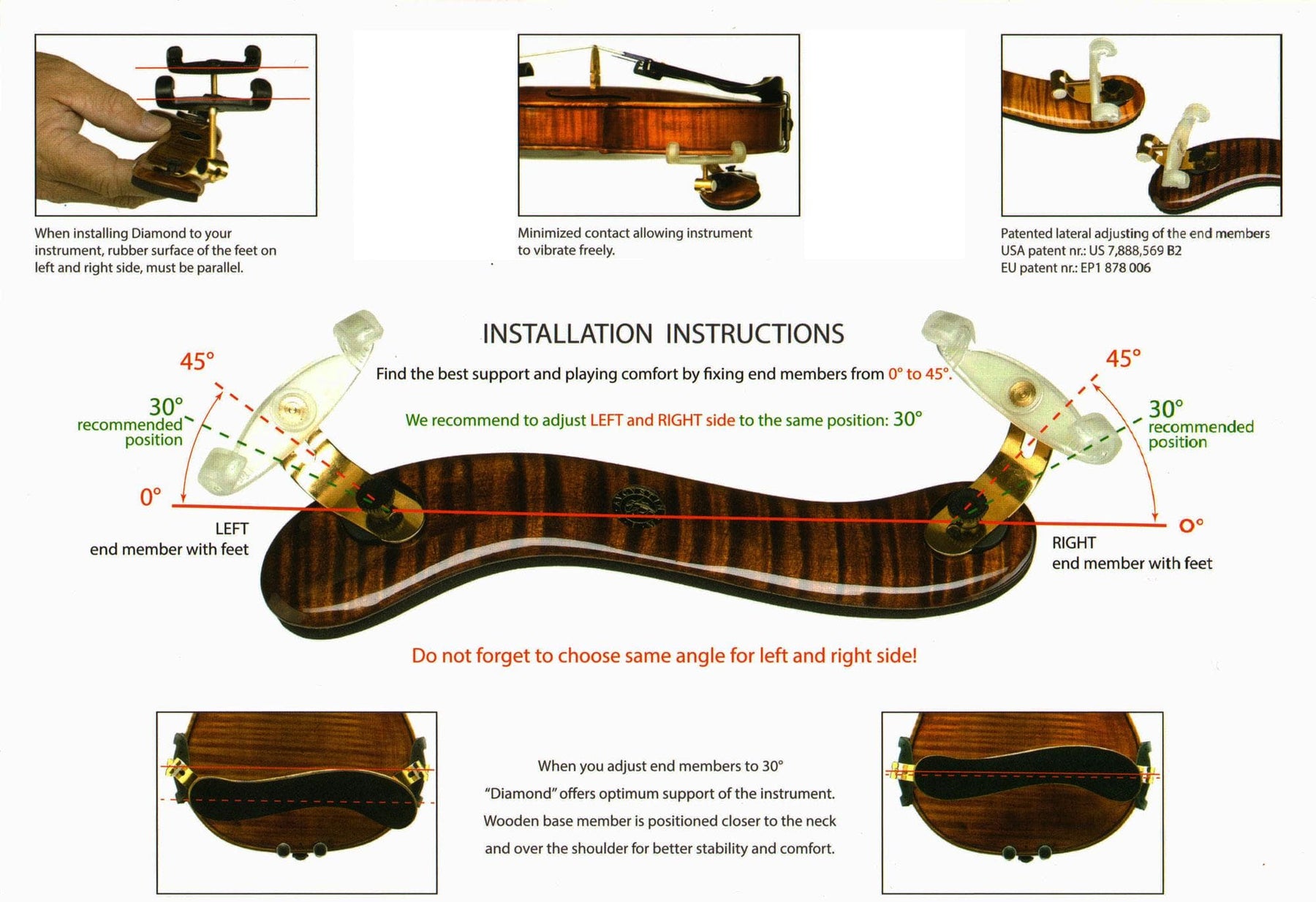Designed especially for the extreme demands of the concert soloist, European-made Viva la Musica Diamond shoulder rests combine comfort with practicality, freeing the artist to focus on the performance. The ergonomics start with fine solid wood carved into an S-shape, designed to distribute weight across the collarbone; this design significantly reduces fatigue, especially under grueling conditions. The patented Lateral Adjustment Clamping System, made from strong and flexible tool steel, absorbs stress instead of transferring it to the instrument, channeling stress away from the instrument itself; and they remain attached rather than sliding off when undergoing extreme performance conditions.