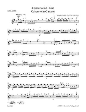 Vivaldi, Antonio - Concert Pieces: Concerto G Major, Op 3/3 - for Violin and Piano - edited by Kurt Sassmannshaus - Bärenreiter