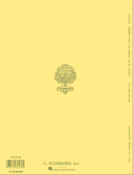 The Schirmer Library of Classics edition of Vivaldi's “Summer" Op. 8, an excerpt from The Four Seasons. Violin and piano parts included. Additional translation of Vivaldi's poems also appears in this volume.