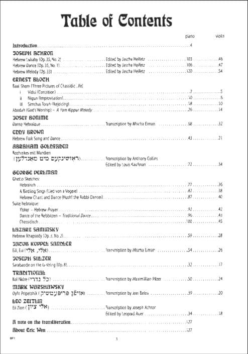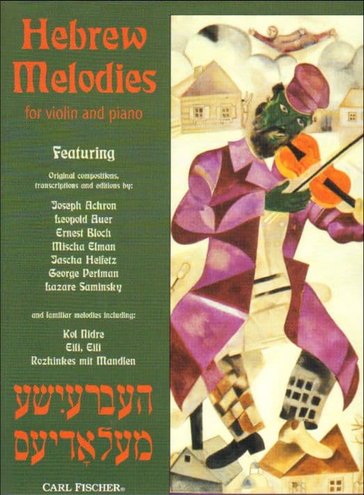 Hebrew Melodies for Violin and Piano is a unique collection of pieces by composers of Jewish background compiled by Eric Wen. Some of the tunes are familiar, such as Kol Nidre; some are not as well-known. Composers and arrangers include George Perlman, Mischa Elman, Jascha Heifetz, and others.
