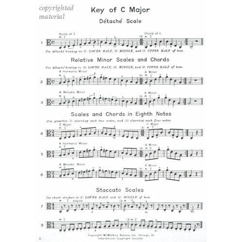Intermediate Scales and Bowings take the concepts introduced in Elementary Scales and Bowings a step further. The scales remain in first position, but in addition to the major scales, the student is also introduced to the basics of minor scales. Exercises employ different bowing techniques, as before, but more rhythmic patterns are added, as well as a variety of meters.