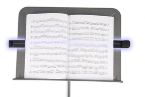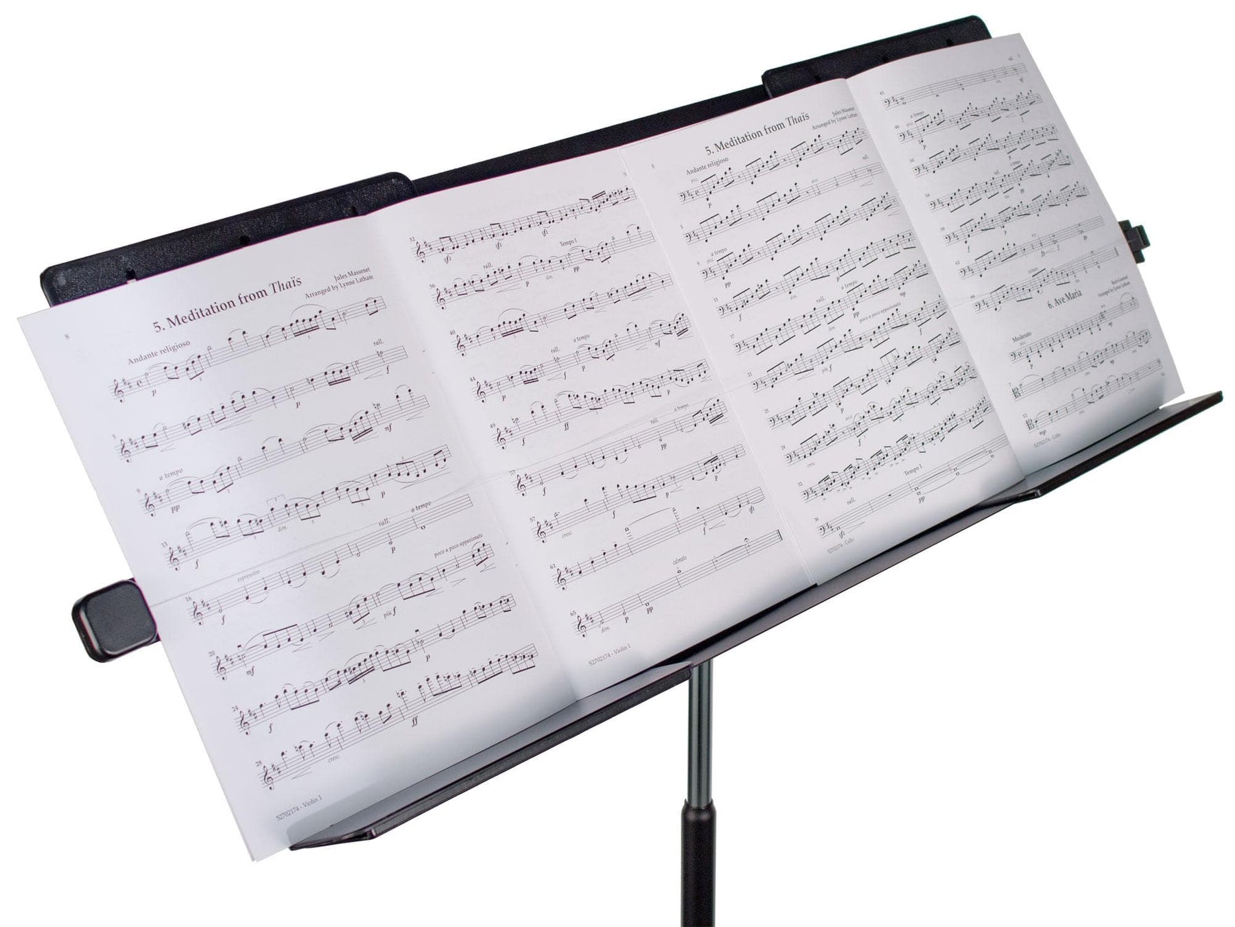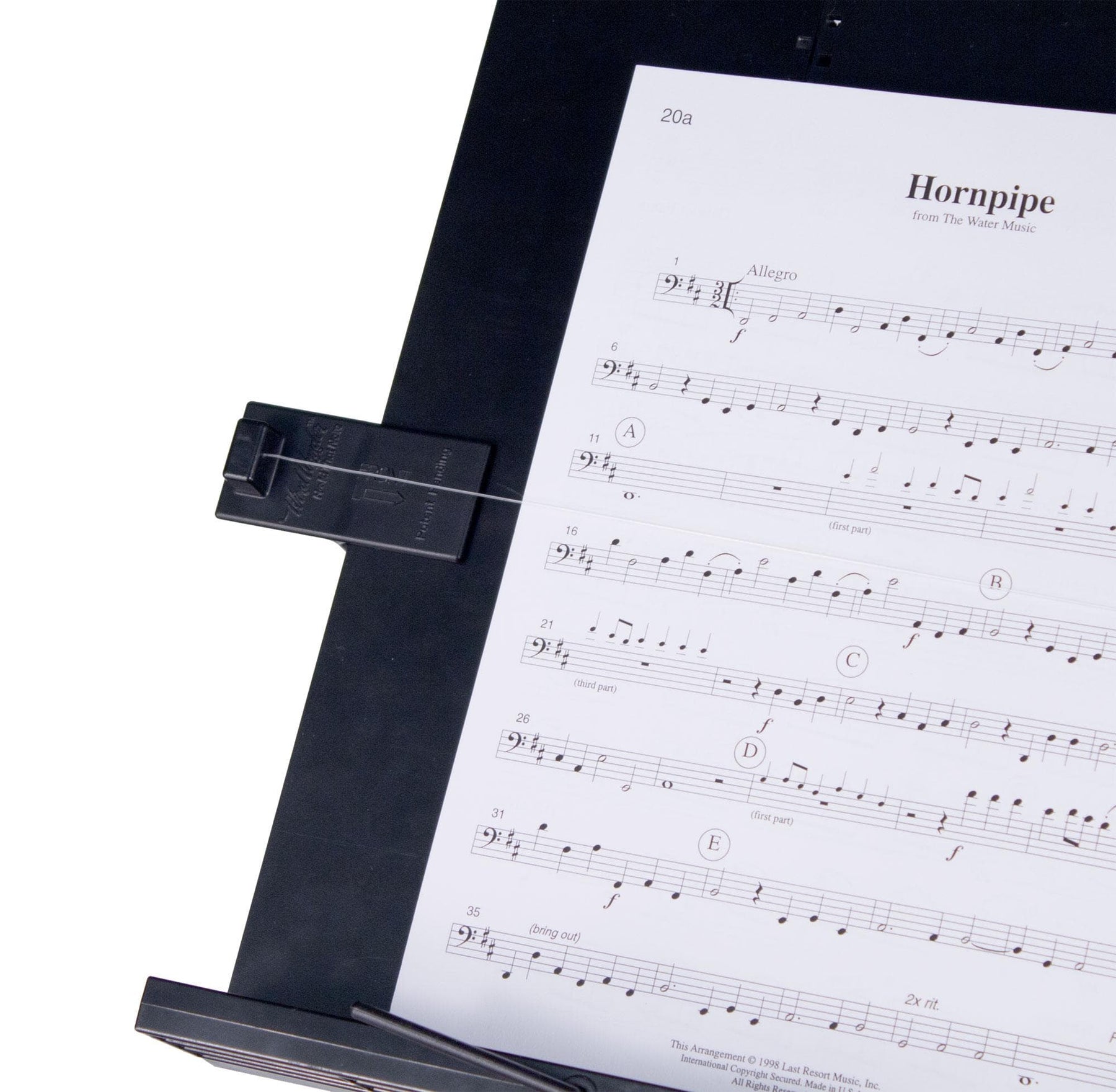 Any musician knows that wind (whether outdoor gusts or indoor drafts) can absolutely ruin performances and practice sessions alike. However, regular music clips like clothespins do not allow for fast page turns when timing matters! Musicians also know what it means to wrestle with a new etude book or scale book with stiff binding, wasting valuable practice time trying to get it to stay open to the right page. Two string musicians, RaJean Higginson and Mary Tolokan, decided there had to be a better way and invented this brilliant device!