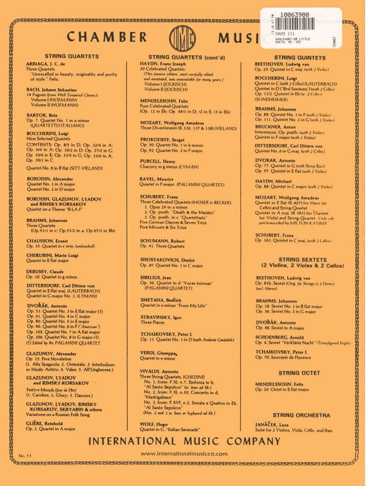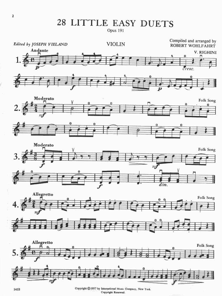 Franz Wohlfahrt is best known for his books of etudes for developing violin technique, but his 28 Little Duets, Op. 191 for violin and viola is a charming collection of short duos. The pieces remain in first position, giving beginners a chance to enjoy some easy chamber music.