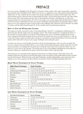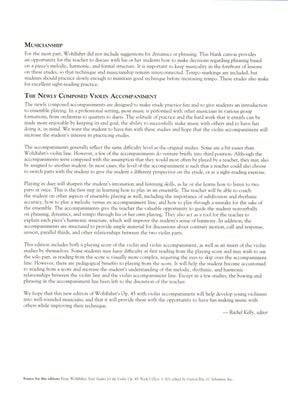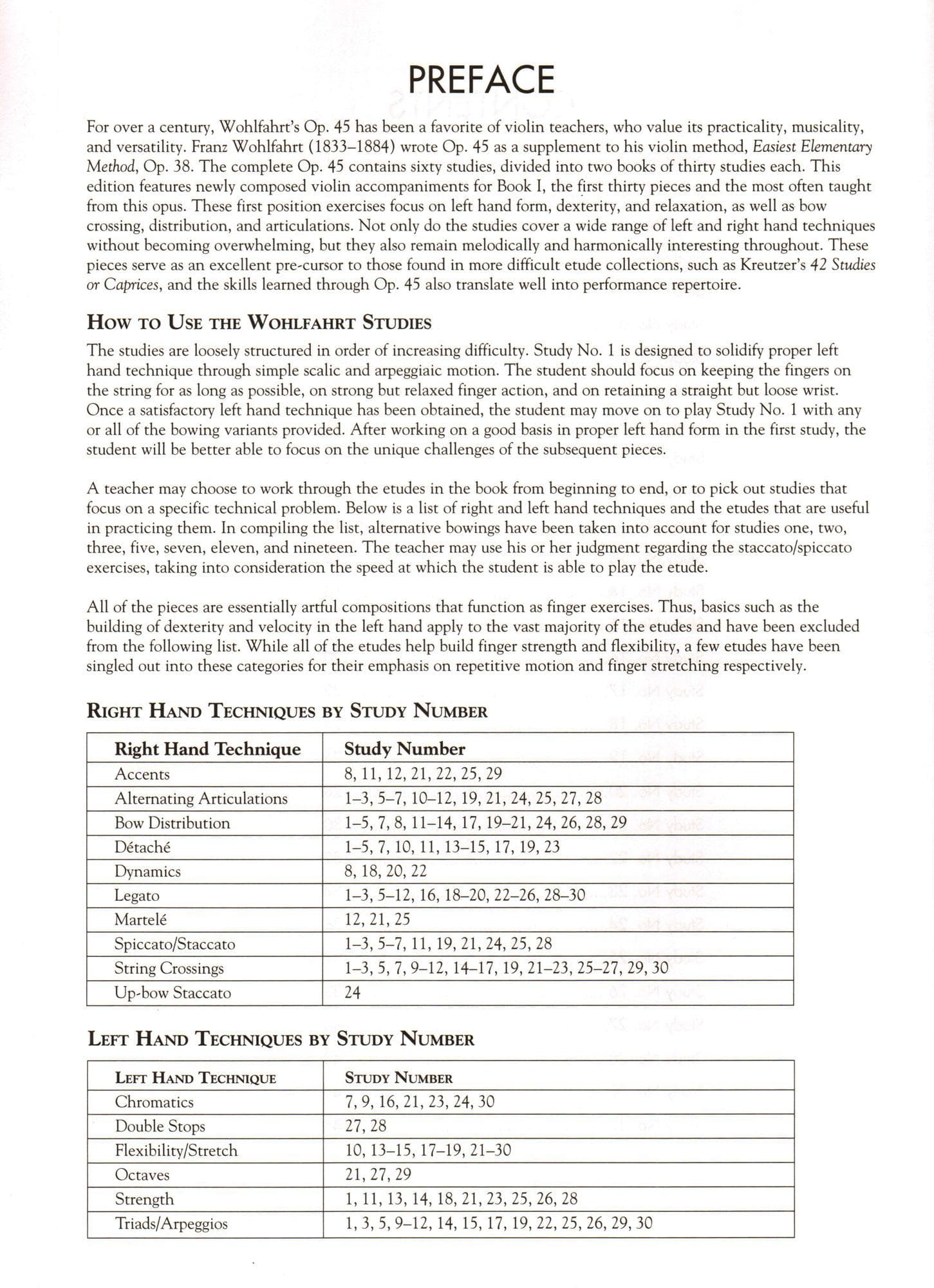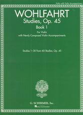 This neatly printed edition of the first half of Wohlfahrt's famous studies, Opus 45, includes newly composed violin accompaniments that are meant for the teacher or another student to play. A perfect first etude book for early intermediate players.