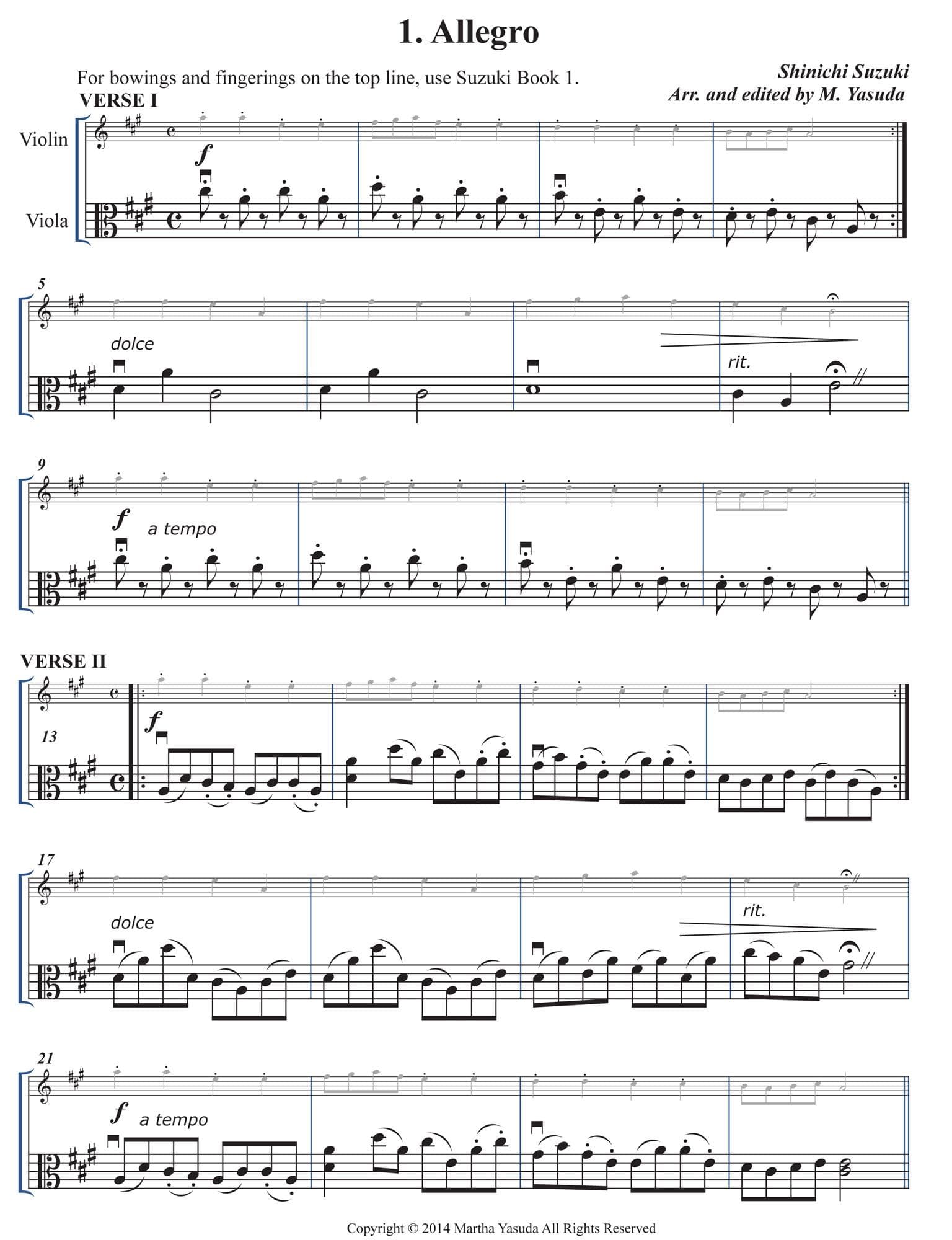 NOTE: Bowings and slurs in certain top melody lines are omitted in order to adhere to copyright law. Please feel free to add your own markings. This second edition reflects copyright requirements of smaller font sizes and gray shading in melody lines as specified by the International Suzuki Association.