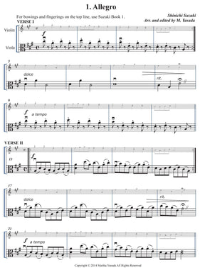 This is an awesome resource for the violist that has violin students - now you can play duos with your violin students on your viola! This book includes the first twelve songs in Suzuki volume one as well as nine additional folk songs! (Camptown Races, Danny Boy, Way Down Upon the Swanee River etc.) There are three verses of difficulty for the violist (easy, medium and hard) and keys chosen are those that lie well for the violin.