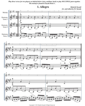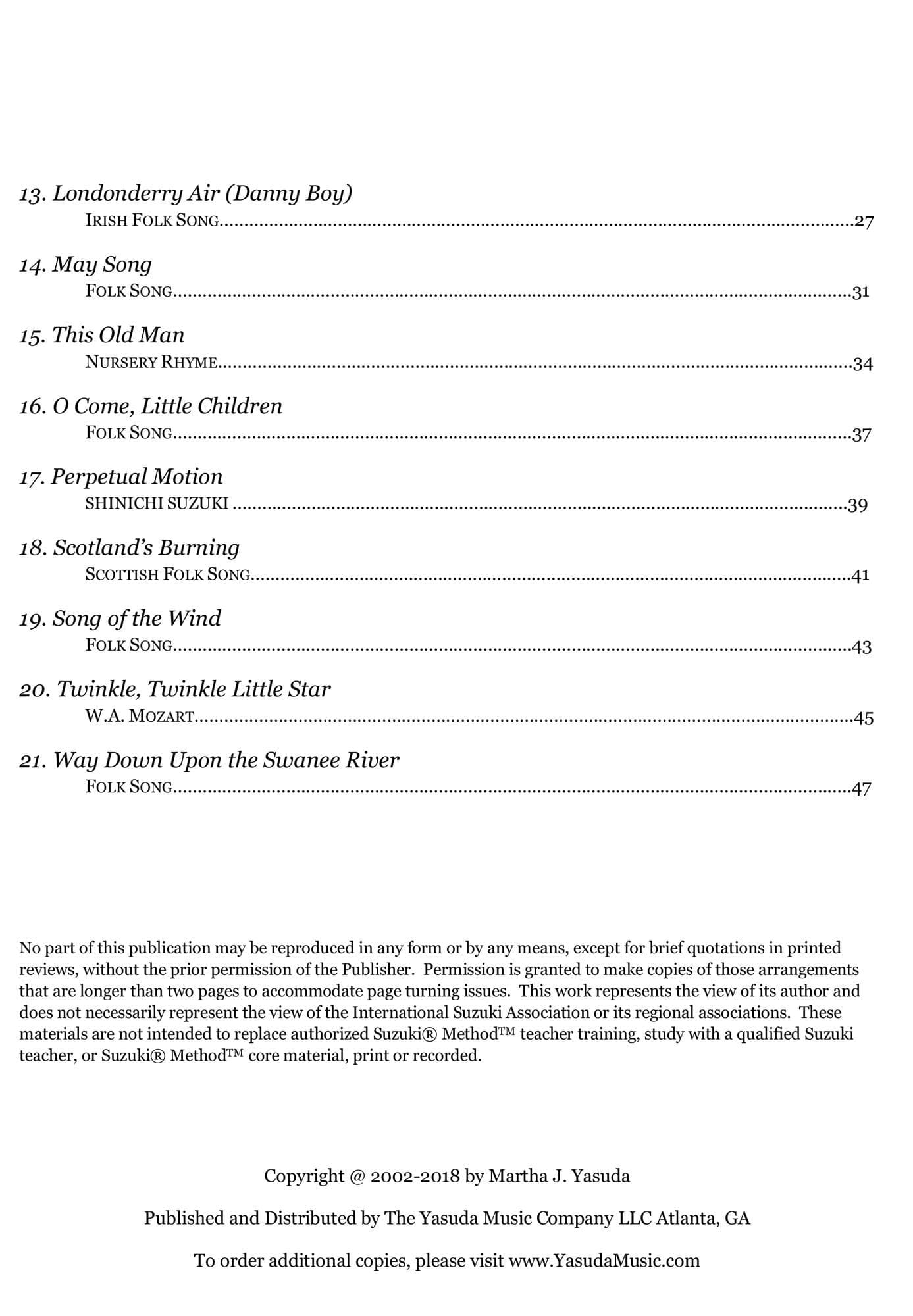 The expanded second edition includes the first 12 pieces from Suzuki Book 1, including arrangements of Dr. Suzuki's Allegro, Perpetual Motion, Allegretto, Andantino and Etude plus 9 non-Suzuki favorites: Camptown Races, Danny Boy, Way Down Upon the Swanee River etc.