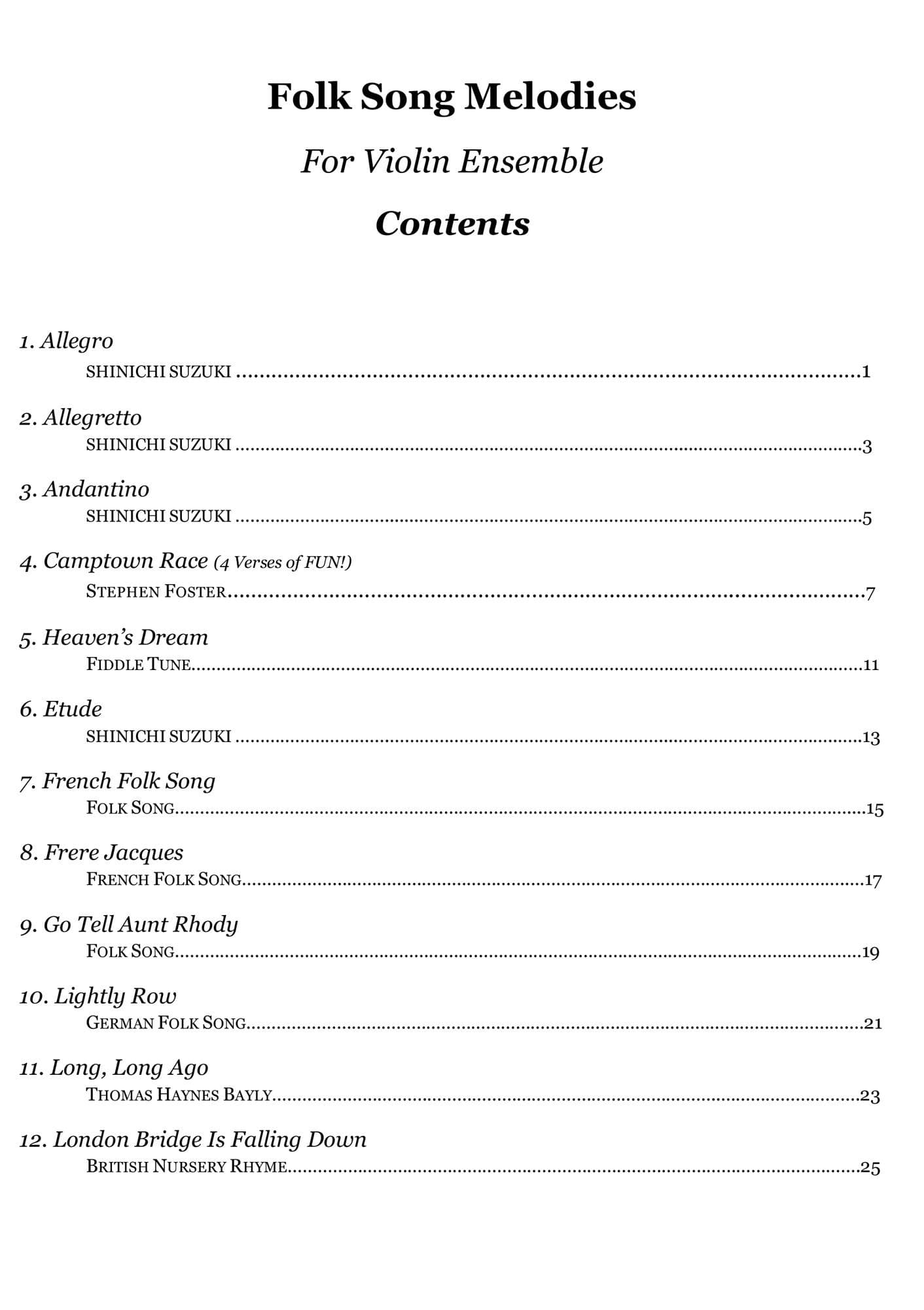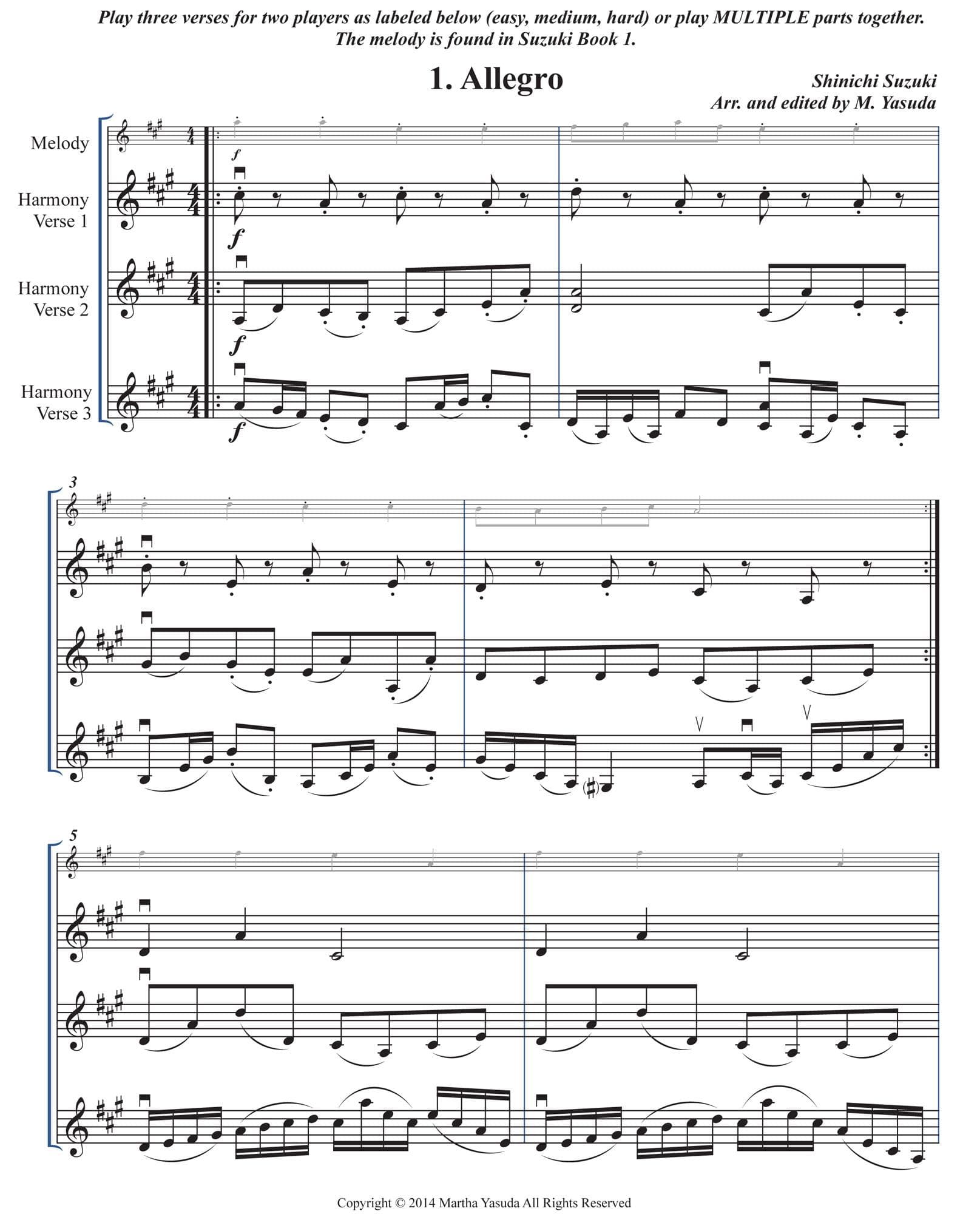 NOTE: Bowings and slurs in certain top melody lines are omitted in order to adhere to copyright law. Please feel free to add your own markings. This second edition reflects copyright requirements of smaller font sizes and gray shading in melody lines as specified by the International Suzuki Association.
