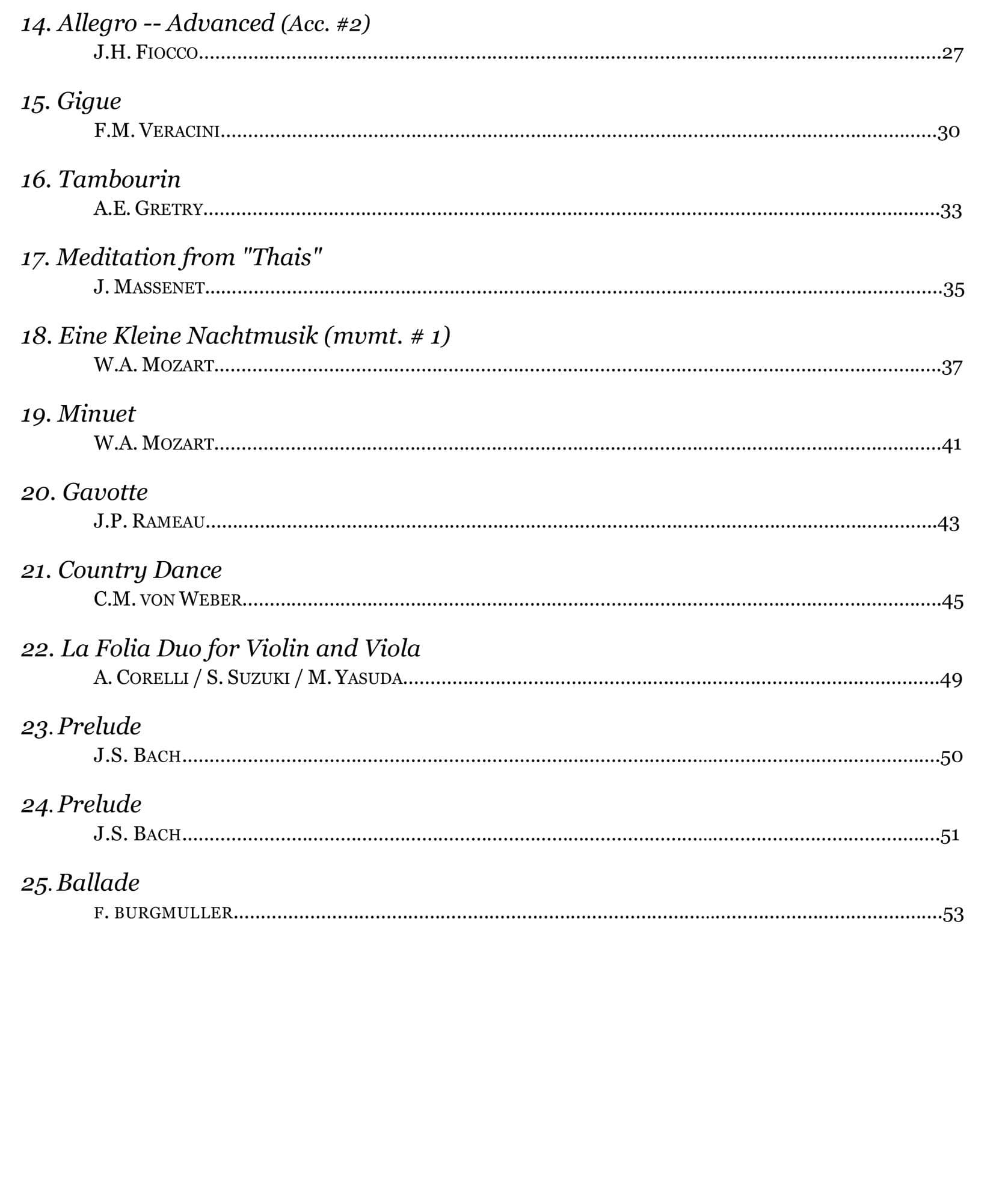 Many of the pieces included are the shorter selections from Suzuki books 5-8, (the Fiocco Allegro, Country Dance, the Veracini Gigue etc.) as well as the Meditation from "Thais," several Bach Two-Part Inventions, Fur Elise etc. Definitely a groundbreaking book to enjoy!