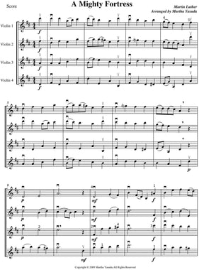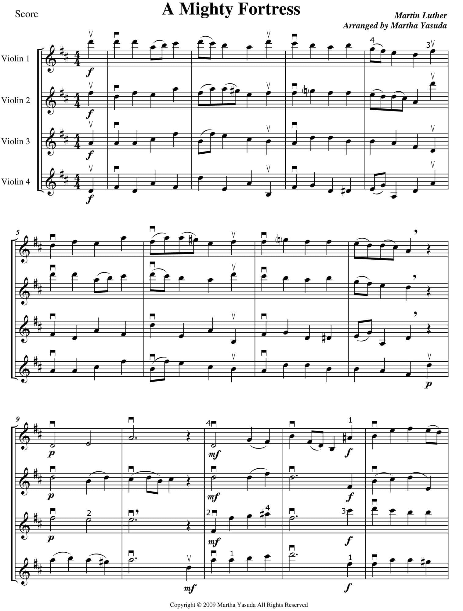 Hymn Melodies For Four Violins contain two arrangements of A Mighty Fortress and Onward Christian Soldiers, which are two of the most famous and well-known hymns of the past century. You will enjoy the contrast between verse one's plain and simple textures compared with the energetic and ornamental verse two! This provides a nice length and also adds contrast.