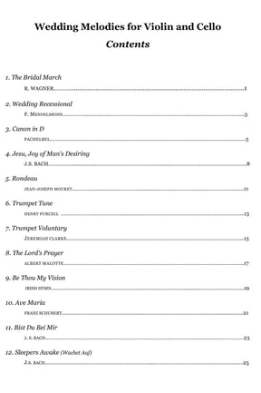This wedding duo book is TO DIE FOR!! Identical titles are used from Wedding Melodies For Two Violins. The content is superb, with fresh, creative harmonies for the cello.