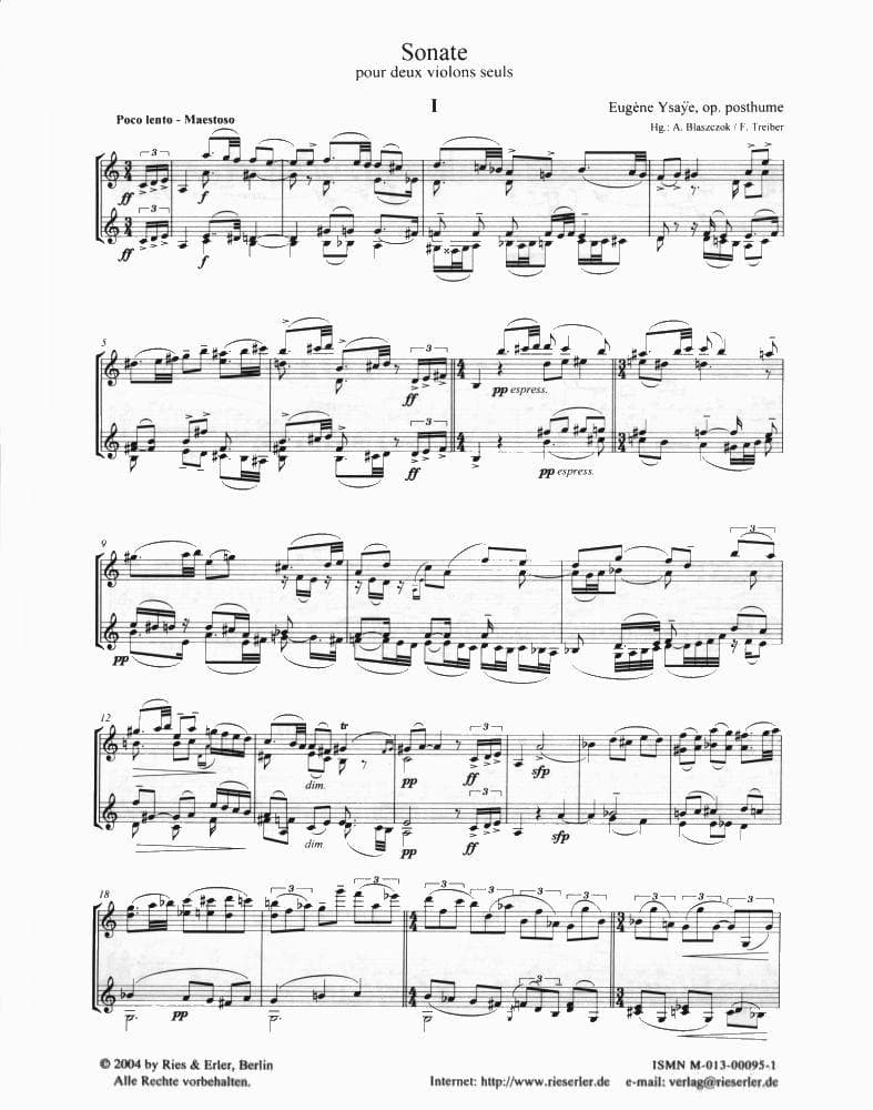 This Sonata for Two Violins was unpublished until after Eugène Ysaÿe's death. In essence, it is a virtuosic tour de force for two solo violins, relying heavily on double stops to create its close, intense sound. Ideally suited to two equally-matched advanced violinists.